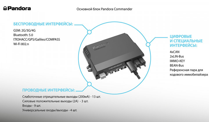 Pandora Commander Фирменный построена на программно-аппаратной платформе FX нового поколения. Система оснащена универсальным GSM-модемом с поддержкой сетей 4G, 3G и 2G, а также модулями Wi-Fi и Bluetooth 5.0; GPS/ГЛОНАСС-антенна обеспечивает стабильный приём спутникового сигнала и точное определение координат автомобиля.